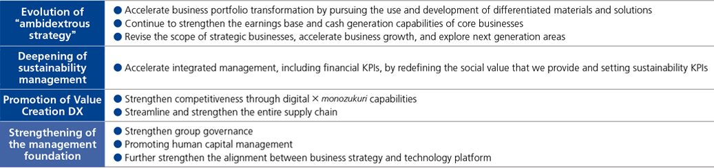 One of the factors behind this was issues in terms of Operational Excellence. One example of this was the occurrence of production problems. The fact that it took time to get this back on track is a point that we need to reflect upon. With our business domains and supply chains expanding globally, we will focus on overcoming challenges at an early stage by leveraging AGCʼs strengths in organizational capabilities and production technologies more than ever before. Continuous innovation in productivity is also a priority for the future. As a manufacturer, improving productivity and innovation greatly contributes to improving our business performance. Under the banner of Operational Excellence, one of “Our Shared Values” in our Group Philosophy, we will further deepen collaboration between the manufacturing and R&D divisions and promote productivity improvement and innovation by making maximum use of digital technology. We will build a robust production process and strengthen the foundations of our business.