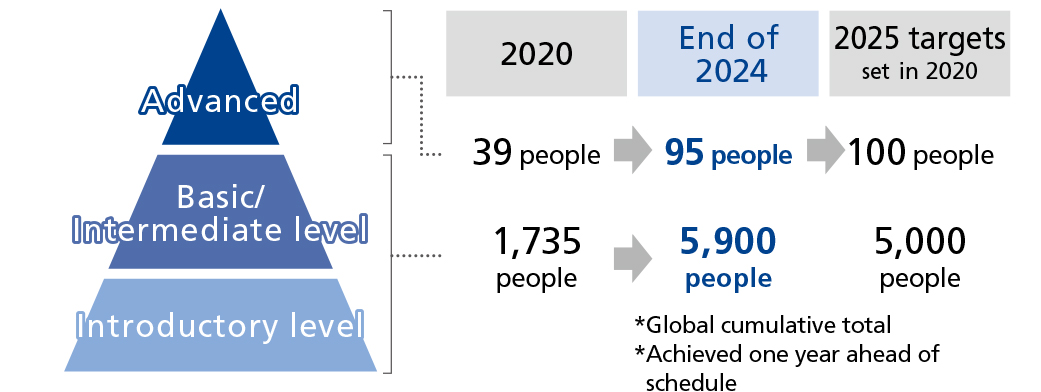 We have been focusing on the fostering of DX-savvy talent since 2017, aiming to develop dual-skilled personnel. These are individuals with strong skills in both manufacturing and administrative operations, who proactively exploit DX to drive improvement and innovation. Currently, we have exceeded our goal of 5,000 people who have completed basic and intermediate level training in DX.