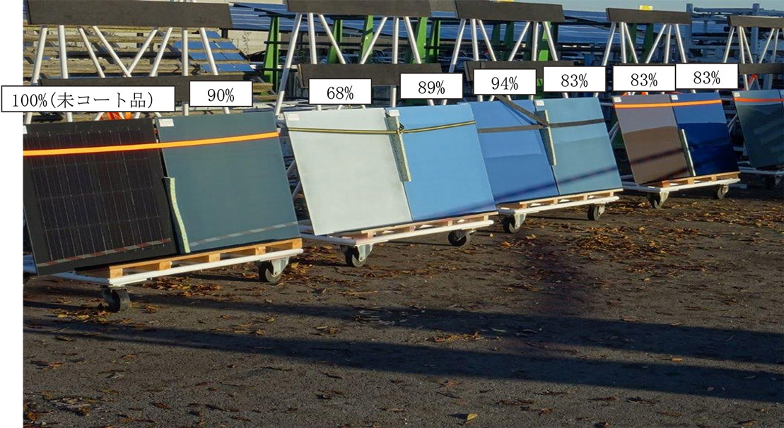 Fig. 3-9は、80×80 cm2サイズで作製したモックサンプルを示している。写真に付記された数値は、実測発電効率の塗膜なしに対する比率を示している。この結果から、80×80 cm2の大スケールにおいて均一な塗工面を形成できること、さらに想定された高い発電効率が得られることが確認された。