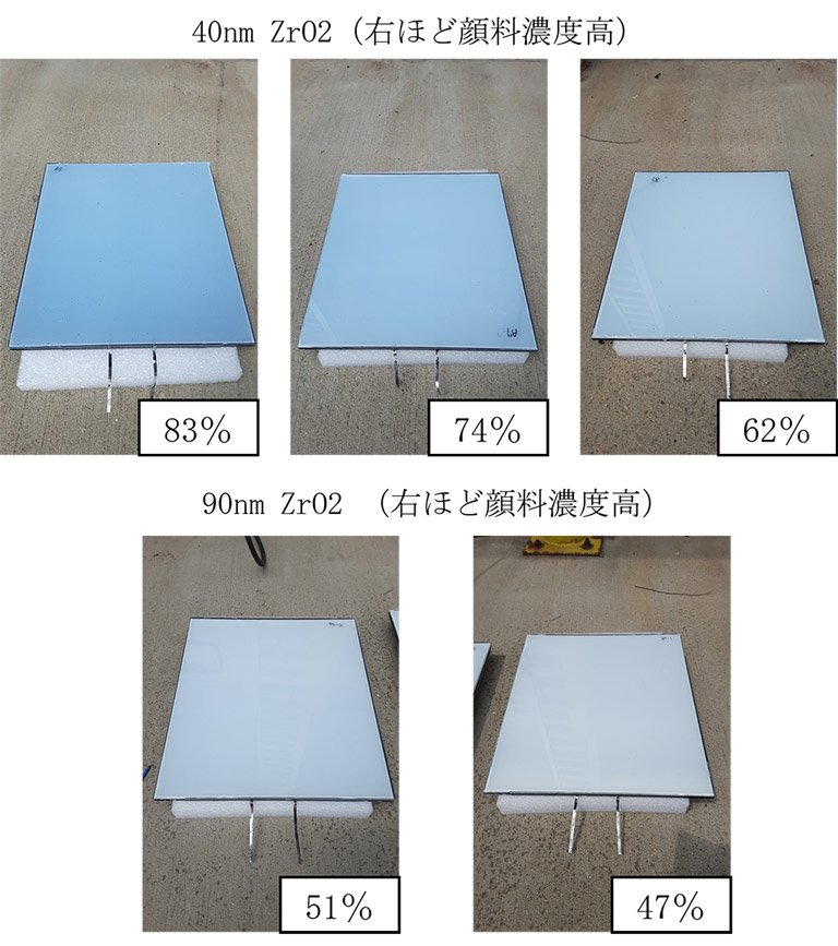 スペクトル曲線の傾斜が急である場合、可視光と赤外線の透過率の差が大きくなる。つまり、赤外域は透過し発電に用いられ、一方で可視光は広範な波長で散乱、反射され、白色の外観を与えることができる。ただし、可視光スペクトルの傾斜が急であるほど発電効率は向上するものの、短波長側が相対的に強く散乱されることになるため、青みがかった外観となる。通常壁材ではよりニュートラルな白色が要求されるため、要求される発電効率と色調に応じ粒子径を選択することが重要である。