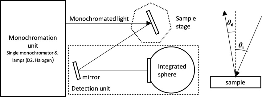プラズマ処理前後の試料の反射外観色、光学特性、表面形態を評価した。反射分光測色計cm-600d(コニカミノルタ株式会社製)を用いて、試料の反射色を色空間座標L*, a*, b*(CIE 1976準拠17)で評価した。L*, a*, b*は測定対象の分光特性に対する変化が人間の色覚とよく対応する。反射率スペクトルの入射角度依存性は紫外可視近赤外分光光度計V-770と自動絶対反射率測定ユニット(いずれも日本分光株式会社製)で測定した。分光光度計と角度依存性測定ユニットの概略図をFig. 1に示した。ランプの白色光がシングルモノクロメータで分光され、得られた単色光が任意の角度で試料に入射し、その反射光を積分球で検出した。サンプルステージと検出ユニットを互いの相対配置が変わらないように回転させ、入射角を変更した。光学系の制約と反射光が比較的強く得られることから、検出角は10度に固定した。プラズマ処理前後における試料の表面形態を電界放出型走査電子顕微鏡(FE-SEM)SU-70(日立ハイテク株式会社製)で観察した。