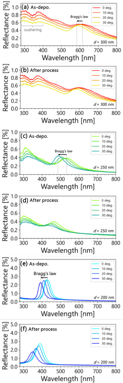 Fig. 4 Reflectance spectra of silica-PEG 3DPhC as a function of incident angle.(a),(c),(e)and(b), (d),(f)depict the reflectance in sample with silica diameters of d =200, 250, 300 nm before and after plasma process.単分散球状シリカから構成されるオパール型3D PhCに関する先行研究によると、3D PhCの(111)に由来する1次の反射波長は直径d =300 nm、250 nm、200 nmに対して~650 nm、~545 nm、~430 nmに得られる23,24。Fig. 4(a)、(c)、(e)に見られた反射ピークは先行研究と概ね一致しており、観測されたピークは(111)由来の反射と考えられる。先行研究と測定結果とのピーク中心波長の差は光学系の検出角や試料の均一性の違いが考えられる。試料の均一性とは、マクロに見たときのフィラーの秩序性を指す。フィラーがマクロにみて整然と並んで長距離の秩序性が高いとき、ピークの広がりは狭くなり、理想的な3D PhCの光学応答が得られる。逆に、秩序性が低いとき、ピークは広がり、ストップバンドの反射よりも散乱の寄与が相対的に増加すると考えられる。