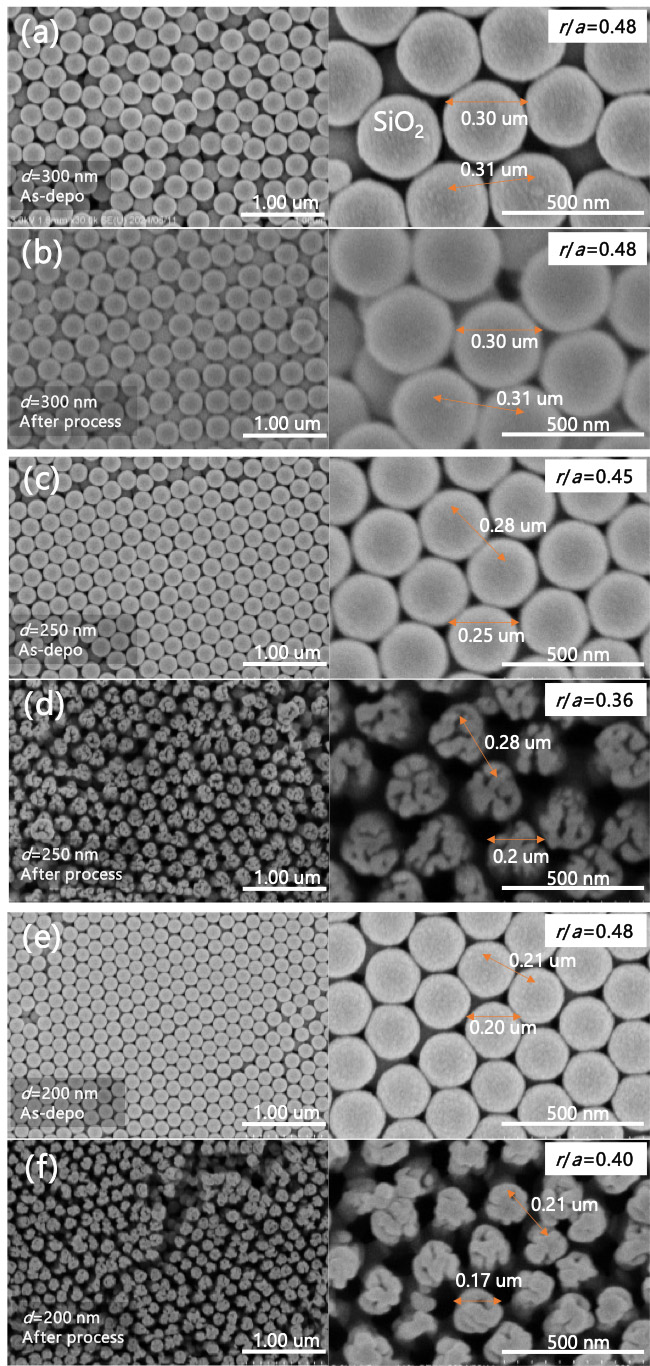 Fig. 5中のSEM像から各粒子の直径dと粒子間隔aを読み取り、F Fを算出した( 図中右上)。F Fは d =250 nmの試料で0.45→0.36、d =200 nmの試料で0.48→0.40と、いずれもプラズマ処理前よりも2割程度小さいFFが得られた。自己組織化により最密充填構造を形成する原理的制約から、シリカPEG 3DPhC含むオパール型3DPhCはFF~0.5に限定される。