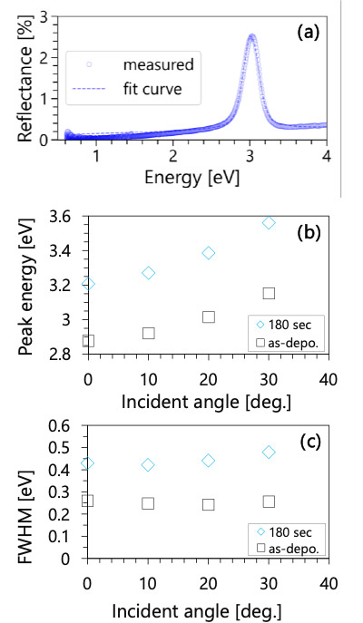 Fig. 6(b)、(c)に示したピークエネルギーと FWHMの角度依存性は反射スペクトル(Fig. 4(e)、(f))と一致しており、正常にフィッティングできた。(散乱によるバックグラウンド除去によって、低エネルギー側をよく再現できる。高エネルギー側のスペクトルにはMie散乱と回折が重畳しており、モデルの検討が必要である。)プラズマ処理前のピークエネルギーは0度で2.88 eV(431 nm)、30度では3.15 eV(394 nm)であったのに対し、プラズマ処理後は0度で3.20 eV(383 nm)、30度で3.55 eV(349 nm)とストップバンドが紫外線領域にまでブルーシフトした。プラズマ処理前後での差は0.31~0.41 eVと入射角度が大きいほど広がった。FWHMの角度依存性はプラズマ処理前で0~30度まで~0.25 eVであったのに対し、プラズマ処理後は0.42~0.48 eVと1.7~1.9倍に大きくなり、入射角度が大きいほど広くなる傾向がみられた。