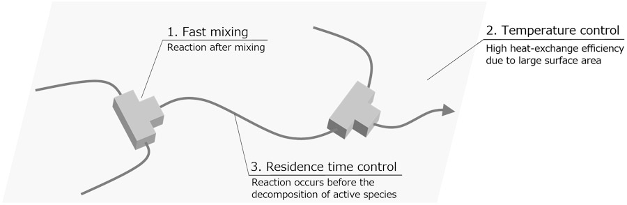 フロー合成反応を行う際には、有機溶媒中に基質を十分に溶解させる必要がある。この連続型反応系では、流路内の一部が閉塞するだけで全体の反応が停止してしまうため、一般に反応液中に固体が存在しないこと、また反応中に固体が析出しないよう制御することが求められる。しかし、有機合成において有用な原料の中には、有機溶媒への溶解度が低く前処理が必要なものも存在する。