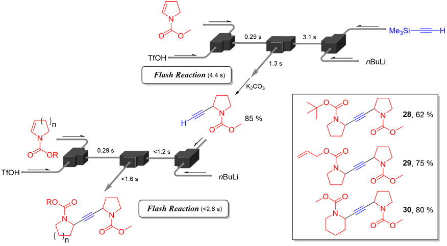 - (a)Petersen, Trine P., Matthias R. Becker, and Paul Knochel. “Continuous flow magnesiation of functionalized heterocycles and acrylates with TMPMgCl・LiCl.” Angewandte Chemie International Edition 53.30(2014): 7933-7937.(b)Yoshida, Jun-ichi, Yusuke Takahashi, and Aiichiro Nagaki. “Flash chemistry: flow chemistry that cannot be done in batch.” Chemical communications 49.85(2013): 9896-9904.(c)Nagaki, Aiichiro, et al. “Flash chemistry makes impossible organolithium chemistry possible.” Chemistry Letters 50.3(2021): 485-492.(d) Shamoto, Otoka, et al. “Peptide cyclization by the use of a c y l a m m o n i u m s p e c i e s . ” A n g e w a n d t e C h e m i e International Edition 62.27(2023): e202300647.