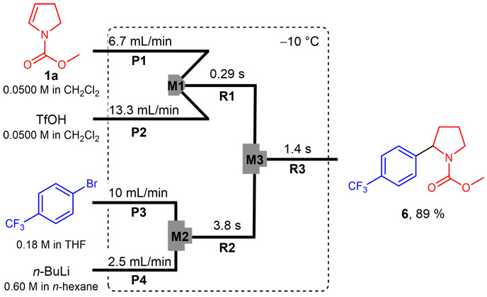 V字型マイクロミキサー(M1、φ =250 μm)、T字型マイクロミキサー2つ(M2とM3、φ =250 μm)、マイクロチューブリアクター3つ(R1–R3)、および4つの予冷ユニット(P1–P4)からなるフローマイクロリアクターシステムを用いた。フローマイクロリアクターは-10 ℃の冷却浴に浸した。カチオン前駆体(1-メチルピロリジン-2-カルボン酸メチル(1a)、CH2Cl2中0.0500 M、流速:6.7 mL/min)の溶液とトリフルオロメタンスルホン酸(CH2Cl2中0.0500 M、流速:13.3 mL/min)の溶液は、シリンジポンプを用いてM1に導入され、その混合溶液はR1(L R1= 12.5cm、t R1= 0.29 s)を通過して、M3に到達した。一方、4-ブロモベンゾトリフルオリド(THF中0.180 M、流速:10 mL/min)の溶液とノルマルブチルリチウム(ノルマルヘキサン中0.60 M、流量:2.5 mL/min)の溶液はシリンジポンプを用いてM2に導入され、混合溶液はR2(L R2= 100 cm、t R2= 3.8 s)を通過して、M3に到達した。これらの溶液はM3で混合され、反応溶液はR3(L R3= 100 cm、t R3= 1.4 s)を通過した。定常状態に達した後、反応混合物の一部を回収し、飽和塩化ナトリウム水溶液で処理した。この反応混合物について内部標準物質を用いてガスクロマトグラフィーにより分析したところ、目的のメチル2-(4-トリフルオロメチルフェニル)ピロリジン-1-カルボキシレート(6)が収率89 %で得られたことが確認された。