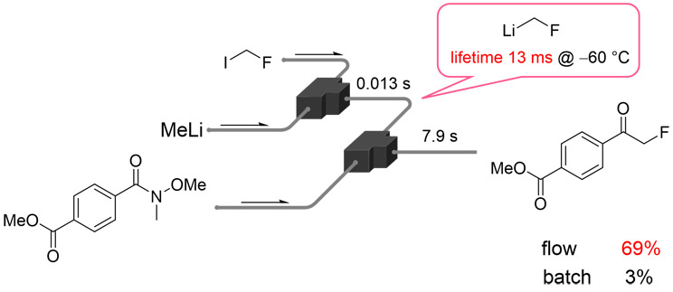 有機合成反応を精密に制御する手法の一つとして、フロー合成法が広く知られている(2)。特に高い反応制御性が求められる場合には、反応管径の小さいフローマイクロリアクターを用いることが有効であり、その微細な反応空間を活かした特異な反応制御が実現する(Fig. 1)(3)。つまり、狭い空間内で反応液が混合されるため混合時間が小さく、細い反応管を用いることで反応液の体積あたりの表面積が増大し、反応温度の制御性が向上する。また、反応管の体積と反応液の流速を選択することで、任意の滞留時間の後に次の反応剤を導入することが可能となる。これらの特徴を活かすことで、フラスコなどのバッチ型反応器では困難な、安定性の極めて低い活性種の活用や高い反応選択性の制御が可能になる(4)。永木らは、不安定なリチウムカルベノイド種をフローリアクター内で発生させ、直ちに続く反応へと利用することで、-60 ℃でわずか13ミリ秒という短い寿命の活性種を効率的に合成化学に適用できることを示した(Fig. 2)(5)。