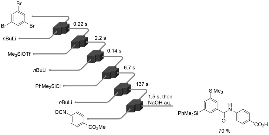 また、フロー型反応器を複数接続することで、反応液を次々に導入しながら化学反応を連続的に進行させる反応集積化技術が知られている(6)。ここで、高反応性の活性種を用いた高速な化学反応を集積化することにより、複数の化学反応を短時間で進行させることが可能になる。反応性の高い有機リチウム種を用いたフロー合成反応を集積化し、1,3,5-トリブロモベンゼンを出発物質としてわずか13秒以内に6段階の反応を完結させ、医薬品前駆体を一挙に合成する手法が報告されている(Fig. 3)(7)。