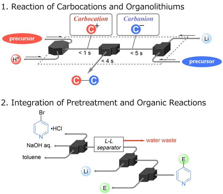 Organic synthesis utilizing flow microreactors takes advantage of confined reaction spaces, enabling the use of unstable reactive species and offering precise reaction control that conventional batch reactors struggle to provide. Integrated reactions, achieved by interconnecting multiple flow reactors to eliminate the need for intermediate separation steps and facilitate continuous chemical processing, have attracted significant attention. This integrated synthesis approach presents numerous advantages, including reduced costs related to separation and purification, as well as the ability to construct complex molecular structures from basic materials in a single flow. However, flow reactions come with inherent challenges, including the risk of channel clogging when organic reactions generate low solubility compounds such as inorganic salts and difficulties in handling substrates with low solubility. Previous investigations in this area have primarily concentrated on anionic reactive species, limiting the diversity of reactions. In this context, this report details the following: (1) the establishment of a rapid and irreversible method for generating carbocations, resulting in a novel reaction system in which cationic species directly react with organolithium species; (2) the development of a flow synthesis system that integrates pretreatment and organic reactions using pyridinium hydrochloride salts with low solubility in organic solvents as a model substrate. These investigations have successfully facilitated C–C bond formation reactions that are challenging to execute in batch processes, providing effective access to high value-added compounds.