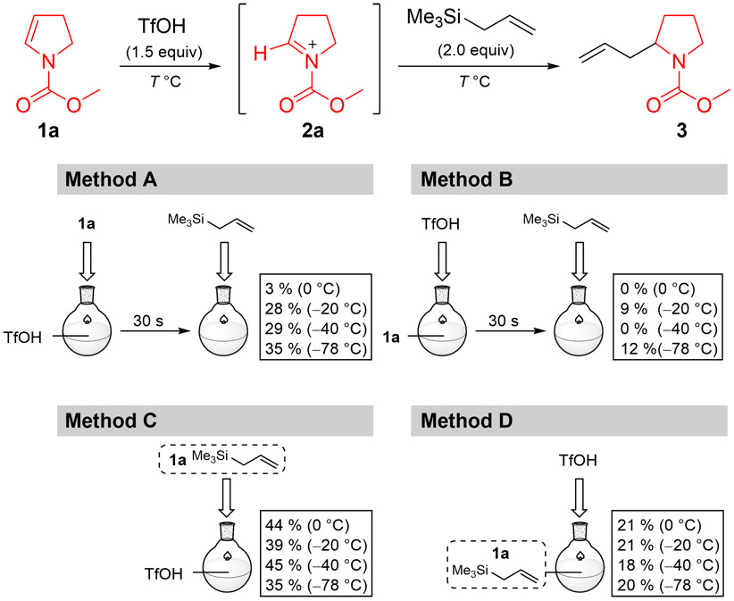 環状エナミン1aをモデル基質として、カルボカチオンの発生条件を検討した(Fig. 5)。ここでは、この基質に対するトリフルオロメタンスルホン酸による活性化と、その後のアリルトリメチルシランへの求電子反応により得られる付加体3の収率を調査した。まず、バッチ法において試薬の添加順や反応温度を変化させながら合成を試みた結果、目的物の収率は低く、最大でも40 %台に留まった。