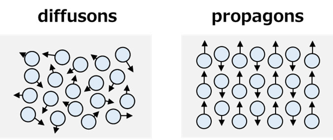 Fig. 1 Schematic of diffusons and propagons in atoms.本研究では、比較的高熱伝導を示すガラス組成系であるアルミノケイ酸塩ガラス系に対して、熱伝導率の評価および上述したモデル解析を行い、高熱伝導領域において半経験式による熱伝導率の予測誤差が大きくなる要因について理解を深めることを目的とする。