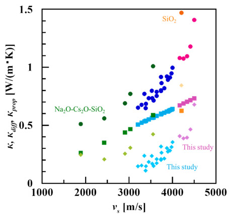 Fig. 10 Thermal conductivity of various glasses (circle:κ , square:κ diff, rhombus:κprop). The values of Na2OCs2O-SiO2 system(green) refers to reference(10). The values of SiO2 refers to reference(9).