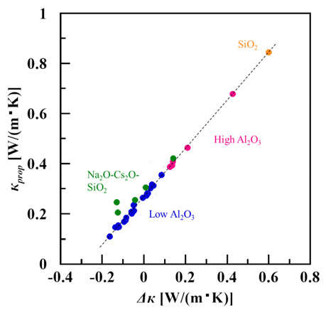 稲葉らの熱伝導率推定式(9)ではフォノンの伝搬を仮定しているため、多くの組成系で計算値と実測値は良い一致を示すものの、シリケート系ガラス、特に高熱伝導率領域において計算値と実測値との間に乖離がみられた。計算値の乖離が熱伝導モードの細分κdiffを定義しているかどうかに起因しているとすると、この乖離が格子熱伝導率κに対するκdiffの寄与がガラス組成により異なるためと考えることもできる。そこで、様々なガラス組成系について議論をするために、Fig. 7と同様に、Fig. 10には横軸を平均音速として実測した熱伝導率κ、および計算されたκdiff、κpropを示す。ここでは、本研究に用いた組成系に加えて、アルカリ混合系Na2O-Cs2O-SiO2系(10)及びSiO2ガラスの値(9)をプロットしている。平均音速に対して熱伝導率κは組成系に依らず増大傾向を示しており、イオン充填率と乖離エネルギーによって成り立つ稲葉らの推定式が成立することに対応している。ただし、組成系が異なるアルカリシリケート系やSiO2ガラスは本研究で用いたアルカリ―アルカリ土類アルミノシリケート系とは離れたところにプロットされる。熱伝導率推定式による計算値と実測値との差Δκ=κ-κcalをκpropの値に対してプロットすると、Fig. 11のような傾向が得られる。シンプルなプロットであるが、両者の間には強い相関がみられた。特に注目すべきは、平均音速が異なるが熱伝導率кの値が近いSiO2(υs =4202[m/s]、κ=1.47[W/(m・K)])とHA-25Mg(υs=4501[m/s]、κ=1.41[W/(m・K)])が同一直線上にプロットされていることである。この線形関係から、熱伝導率の推定式において実測値との差異が生じてしまう原因はpropagonsの寄与が推定式に正確に反映されていないためであると考えられる。すなわち、propagonsの伝搬とガラス組成・構造との関係性を理解することで、ガラスの熱伝導率の予測精度を向上させることができると言える。