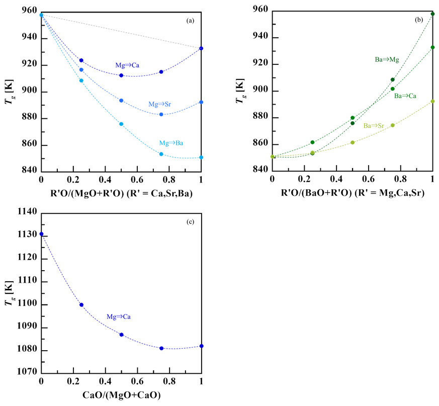 Fig. 2にガラス転移温度のアルカリ土類混合比に対する変化を示す。ここで、横軸はアルカリ土類金属酸化物の総含有量における任意の1種のアルカリ土類金属酸化物の含有量の割合(R’O/(RO+R’O)、R, R’ =Mg, Ca, Sr,Ba)を示す。Fig. 2に示すように、ガラス転移温度はどの混合系においても非線形な組成依存性を示し、アルカリ土類金属の置換率によってガラス転移温度は減少した。Mg/Ca混合系では、MgイオンとCaイオンの濃度が等しい組成(CaO/(MgO+CaO)=0.5)に近い領域で最大の混合アルカリ土類効果が確認されたが、置換するイオンのサイズが大きくなるにつれて、混合効果が最大となる組成は置換率の高い(1に近い)側にシフトした(Fig. 2(a))。非線形な混合効果はMg/Ca混合系における粘性に関連する特性(ガラス転移温度(22)、フラジリティ(22)、軟化点(23)、高温粘性(24))で報告されており、本研究ではSrやBaを含むアルカリ土類混合系でも同様の非線形な物性変化が確認された。混合による非線形応答の要因として、混合によって引き起こされる過剰エントロピーの増大(24)や異種カチオンによる酸素イオンの安定化(25)が唱えられているが、Kjeldsenら(22)の系統的な調査では、後者の仮説は実験結果とは正反対のことを示していると説明されている。