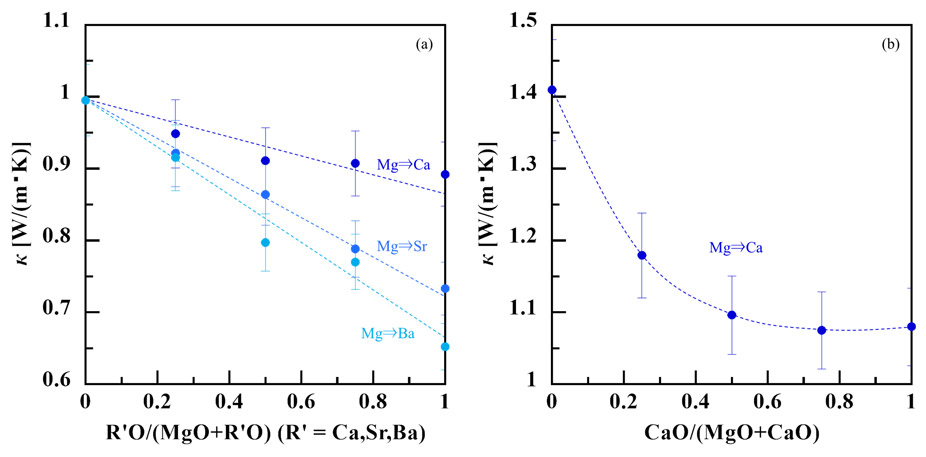 Fig. 3 Thermal conductivity of Mg/Ca mixed systems.(a) κ in low Al2O3 system,(b)κ in high Al2O3 system. Dash lines represent the apparent relations.