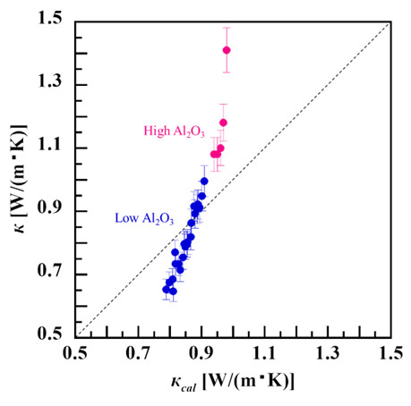 Fig. 5Fig. 5 Comparison of calculated and measured values of thermal conductivity. Blue plots: low Al2O3 system, pink plots: high Al2O3 system. Dash lines represent κ = κcal.