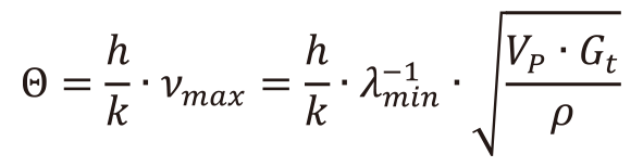 (15)このうちデバイ温度は、ガラス中を伝搬するフォノンの最大振動数が、デバイモデルにおける振動数の上限を与えるとすれば、以下の(16)式で表すことができる。