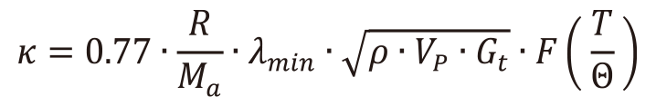 (13)ここで、Mαは平均原子量[g/mol]、NAはアボガドロ定数[mol-1]である。(7)式に(12)式及び(13)式を代入することで、熱拡散率の推定式(14)を得る。