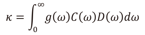 (20)詳細は割愛するが、Bose-Einstein統計から導き出される格子振動の熱容量C(ω)と、ランダムウォーク理論に基づくAllen-Feldmanの拡散理論によって導かれる熱拡散率κdiff(ω)を用いることで(14,16,20)を参照)、diffusonsの最大熱伝導率κdiffは系の状態密度 g(ω)のみで表すことができる。