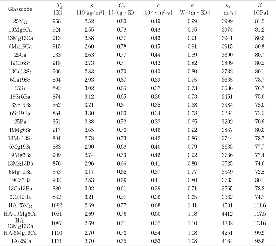 Table 3に本研究で作製したガラスの各種物性値を示す。ここで、比熱、熱拡散率、熱伝導率は室温の値である。物性によっては複数回測定しており、装置精度と合わせた標準誤差はそれぞれ、密度は±0.1%以下、比熱は約±3%、熱拡散率は±1%以下、熱伝導率は約±5%以下、ヤング率は約±1%と見積もられた。含有しているアルカリ土類金属の種類・比率に依存して、物性値に大きな変化がみられた。熱伝導率κは0.65〜1.41[W/(m・K)]と広く分布しており、HA-25Mgの熱伝導率κ=1.41[W/(m・K)]は、 SiO2ガラスの値κ=1.47[W/(m・K)]に匹敵した。