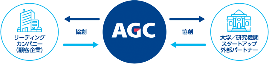 近年は社会の変化が加速し、お客様ニーズも高度化、多様化しているため、AGC単独では課題解決が難しくなりつつあり、外部パートナーとのオープンイノベーションによる協創活動が重要となっています。AGCでは、2軸でのオープンイノベーションを進めています。一つはアカデミアやスタートアップ企業などとの協創により、革新的な技術やAGCにない技術を開発する活動、もう一つはお客様であるリーディングカンパニーと協創し新たな商品を開発する活動です。そのために、AGC横浜テクニカルセンター内に協創空間「AO(アオ/AGC OPEN SQUARE)」を設け、「つなぐ」「発想する」「ためす」をコンセプトに、協創の場を設けるなど、オープンイノベーションを進めています。